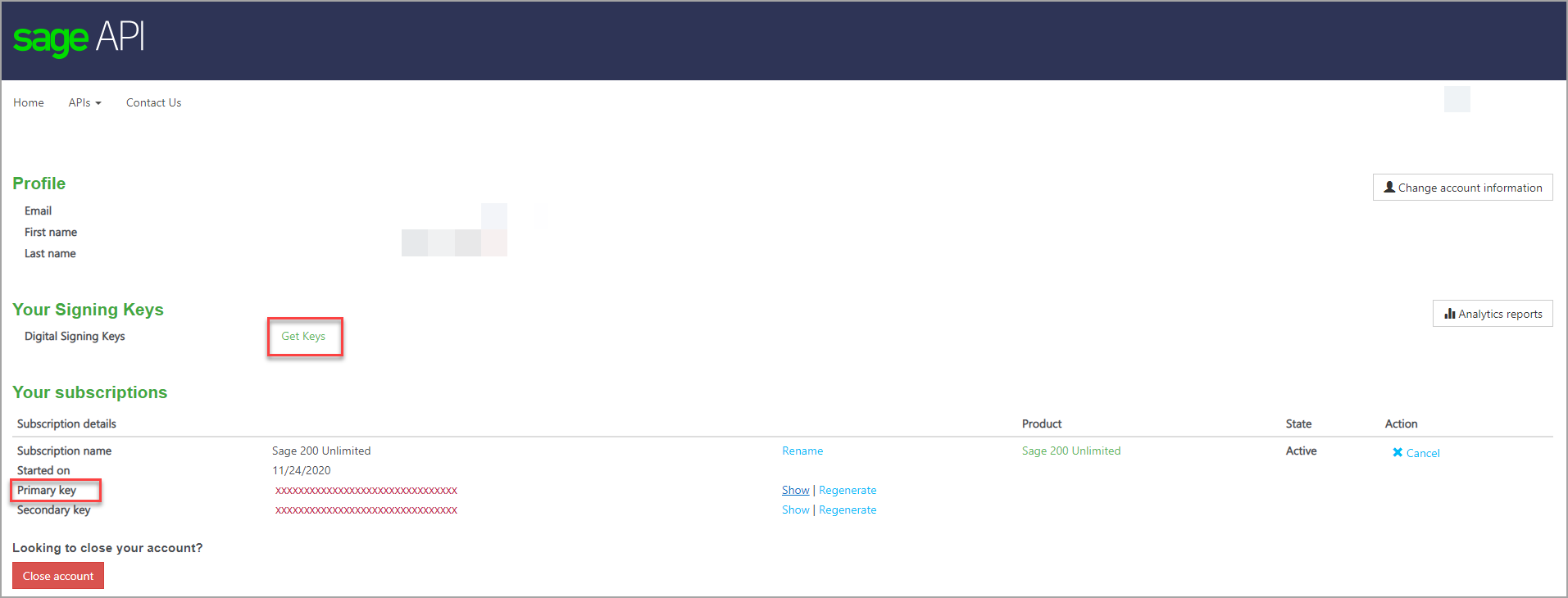 3. Retrieve subscription key by subscribing to the Sage 200 APIAPI A set of rules and protocols that allows different software applications to communicate with each other. Codat provides APIs for accessing financial data from accounting, banking, and commerce platforms. on the Sage 200 API page for developers.